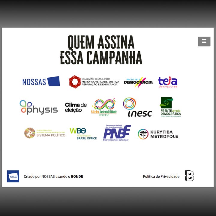 Nossa equipe entrou em contato com o NOSSAS, com o Pacto pela Democracia e com o Washington Brazil Office para solicitar esclarecimentos sobre o financiamento, a estrutura da campanha e os métodos de mobilização utilizados. Nenhuma das organizações respondeu até o fechamento desta reportagem.