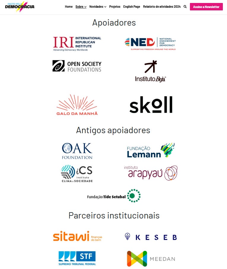 Entre os “antigos apoiadores” do Pacto aparecem Fundação Lemann, OAK Foundation, Instituto Arapyaú, iCS e Fundação Tide Setubal. Já entre os parceiros institucionais há entidades como Sitawi, KESEB, Meedan — e até o próprio Supremo Tribunal Federal figura na lista.