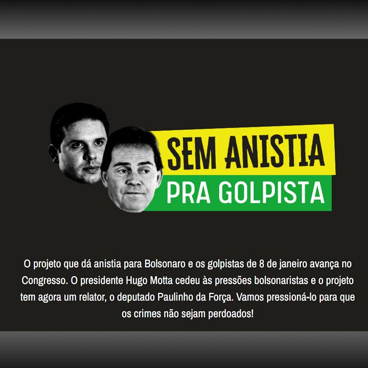O carro-chefe da mobilização digital contra o PL da anistia é o site “Sem Anistia pra Golpista”, apresentado como uma mobilização espontânea da sociedade civil. Segundo registros públicos, o domínio do site “Sem Anistia pra Golpista” foi registrado em 8 de janeiro de 2023, no mesmo dia dos atos em Brasília. Apesar disso, a campanha só passou a operar de fato em 26 de novembro de 2024, segundo registros. Foi nessa época que o slogan começou a circular nas redes sociais.