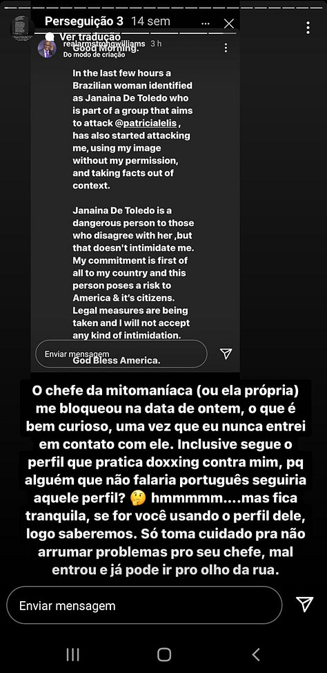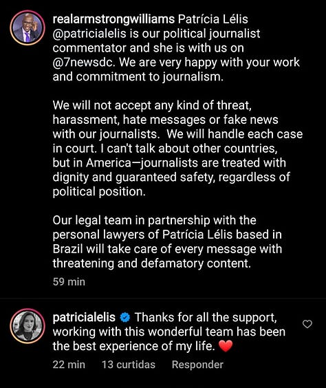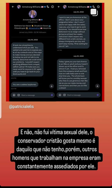 Na época, diversos alertas foram feitos a Armstrong Williams sobre o histórico de Patrícia Lélis. Mesmo assim, ele a defendeu publicamente, chamando críticos de “fakes” e dizendo que ela trabalhava com “profissionalismo e seriedade”. As postagens, porém, chamaram atenção pelo inglês pobre, levando muitos a suspeitarem que as mensagens teriam sido escritas pela própria Patrícia, com acesso às contas dele. Ainda assim, Armstrong manteve a parceria e chegou a levá-la a eventos privados e festas de família. Durante a apuração, notei que estou bloqueado por Armstrong no Instagram mesmo sem nunca ter interagido com ele.