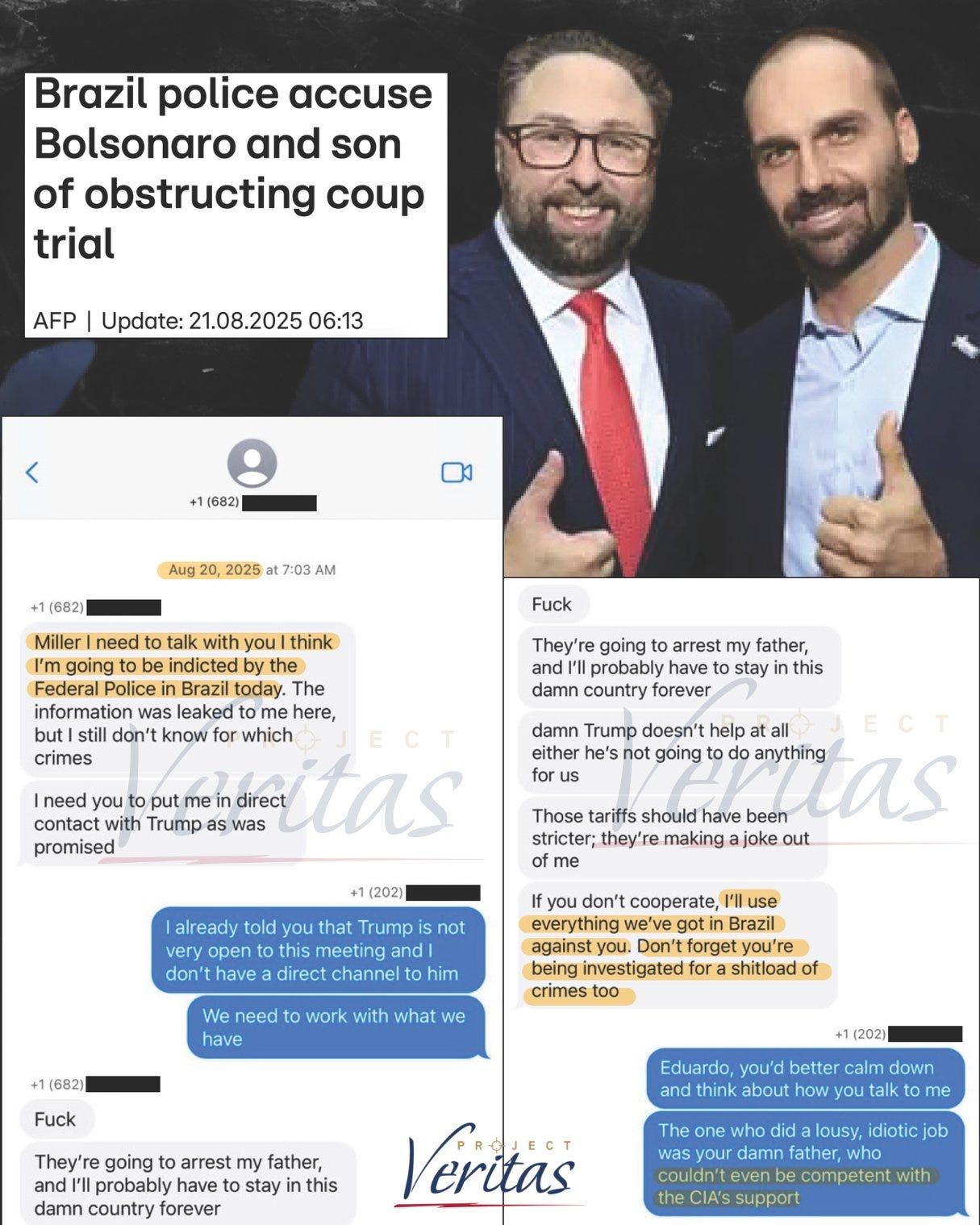 Dias depois, o Project Veritas trouxe novas acusações, apresentadas como parte de uma “investigação especial” paralela à série sobre Bill Barr. Desta vez, o escândalo envolvia o suposto vazamento de mensagens trocadas entre Eduardo Bolsonaro e Jason Miller, ex-assessor de Donald Trump. Os diálogos, datados de 20 de agosto de 2025, mostrariam o deputado brasileiro em pânico diante de uma possível denúncia da Polícia Federal, pedindo ajuda direta a Trump e mencionando apoio da CIA ao governo Bolsonaro.