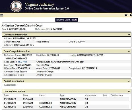 Williams percebeu as fraudes — ela não apresentava casos reais, nem comparecia a audiências —, confrontou Patrícia e a demitiu. Em seguida, entregou o caso ao FBI. Em 12 de janeiro de 2024, a Promotoria do Eastern District of Virginia anunciou o indiciamento: 14 acusações de fraude eletrônica (wire fraud), três de transações monetárias ilegais e duas de roubo qualificado de identidade (aggravated identity theft). A pena por fraude eletrônica pode chegar a 20 anos de prisão. O comunicado do Departamento de Justiça informou que Patrícia não estava sob custódia e pediu ajuda pública para localizá-la.