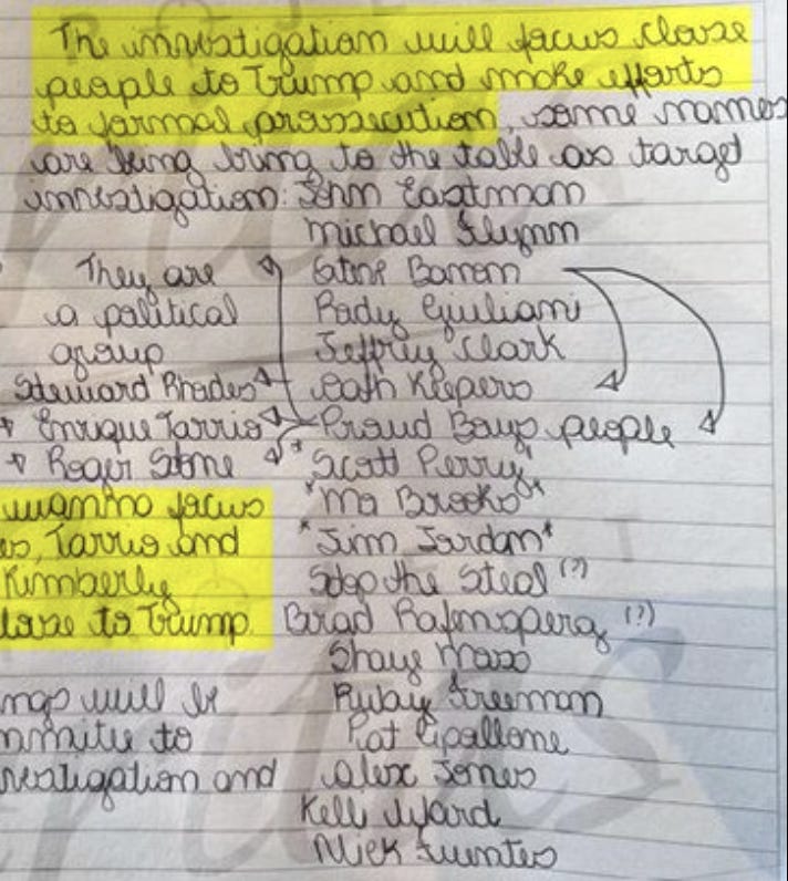 O Veritas exibiu como “provas” capturas de tela, mensagens e uma “lista de inimigos” supostamente escrita por Barr, mas que, conforme confirmou The Bulwark, foi produzida pela própria Patrícia Lélis e entregue ao grupo. A caligrafia é compatível com a dela, e não há indício de autenticidade documental. O conteúdo, por sua vez, é logicamente inconsistente: a lista inclui pessoas que Barr, em tese, teria tentado “enquadrar” como inimigas de Trump — entre elas Brad Raffensperger, Ruby Freeman e Shaye Moss, justamente alvos de ataques de trumpistas. “Se Barr fosse o arquiteto de uma conspiração contra Trump”, ironizou Sommer, “por que ele miraria em pessoas que o desafiaram?”