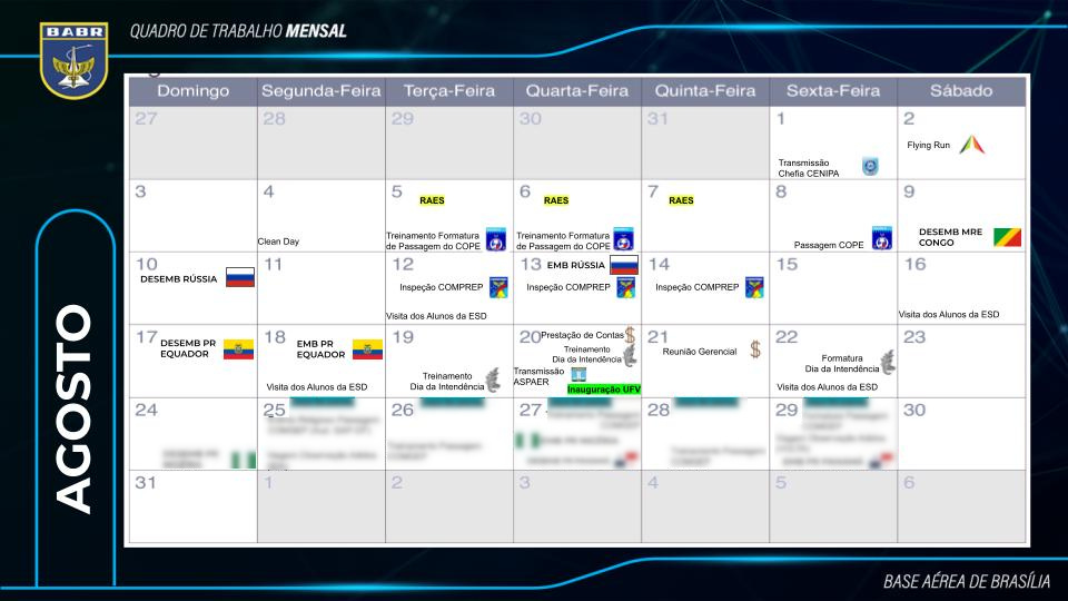 Agora, um documento interno da FAB lança nova luz sobre o episódio. Um calendário interno (QTM de agosto) da BABR anotou “DESEMB RÚSSIA — 10/8” e “EMB RÚSSIA — 13/8”. As siglas significam desembarque e embarque do avião, indicando janela de chegada e saída previamente organizada. Segundo fontes ouvidas pela reportagem, esse calendário não está classificado como sigiloso: se encontra disponível na página inicial da intranet da Base Aérea de Brasília, em “caráter ostensivo” para todo o efetivo. Ou seja, não se trata de um vazamento confidencial nem de acesso hacker, mas de um documento de rotina usado para planejamento operacional.