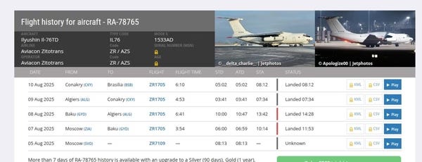 Um cargueiro estratégico russo Ilyushin IL-76TD (RA-78765) pousou em Brasília em 10 de agosto e permaneceu até o dia 13, estacionado na Base Aérea de Brasília (BABR). A aeronave é operada pela Aviacon Zitotrans, empresa alvo de sanções dos Estados Unidos desde 2023 por transportar material bélico para a Coreia do Norte e realizar voos de carga para a Venezuela e países da África, em violação a embargos internacionais contra Moscou.