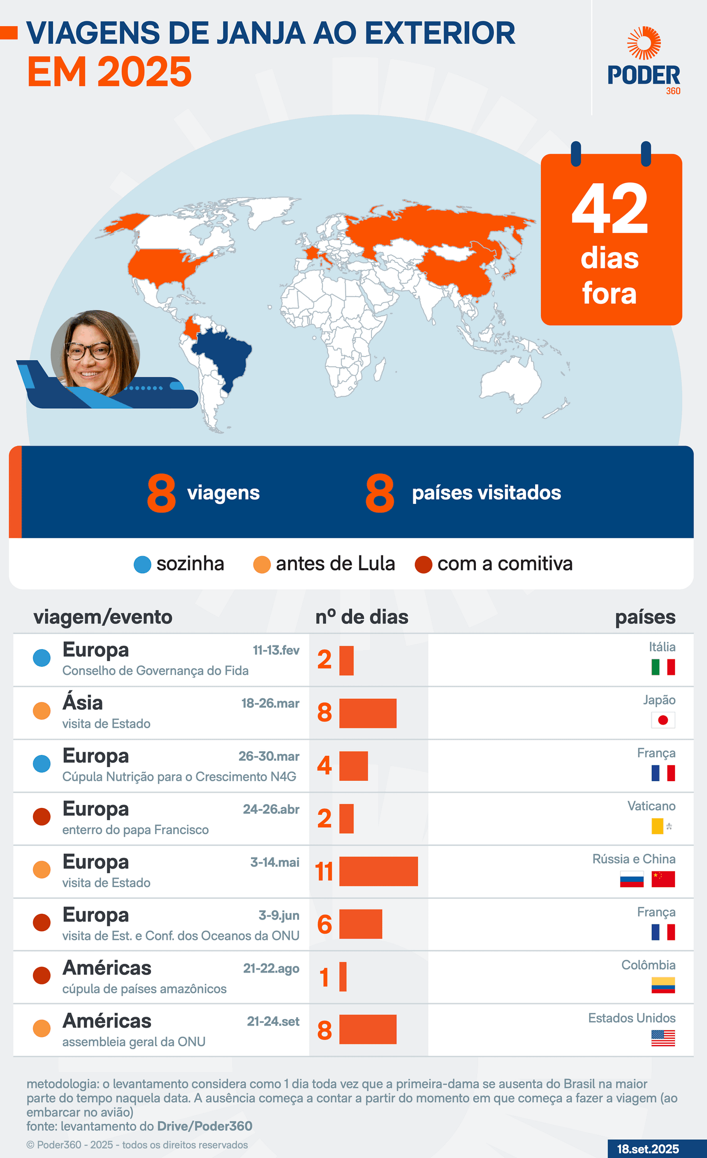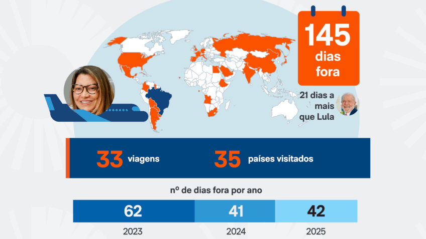Segundo apuração do Portal Metrópoles, em apenas sete meses como primeira-dama, Janja viajou com Lula mais do que Michelle Bolsonaro viajou com o marido em quatro anos de governo. Um segundo levantamento, do Poder360, publicado em setembro de 2025, mostra que desde a posse do petista, Janja já havia passado 145 dias fora do Brasil — o equivalente a cerca de 15% do governo Lula no exterior, praticamente um dia fora a cada sete de mandato. Ao todo, foram 33 viagens por 35 países, 21 dias a mais que o próprio presidente no mesmo período.