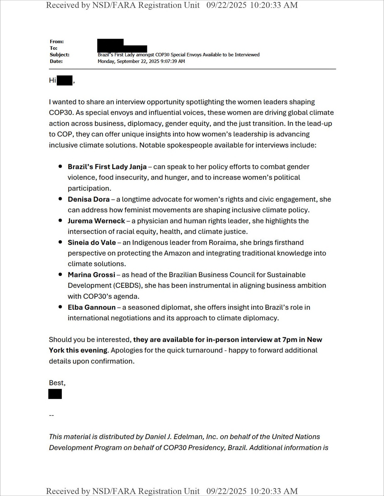 O episódio mais recente ocorreu em Nova York, em setembro de 2025, durante a Semana do Clima da ONU. Janja viajou antes de Lula e participou de painéis ligados à COP30 — justamente no mesmo dia em que a Edelman, contratada com verba da ONU, distribuiu o e-mail registrado no Departamento de Justiça dos EUA oferecendo entrevistas com “líderes mulheres da COP30”.