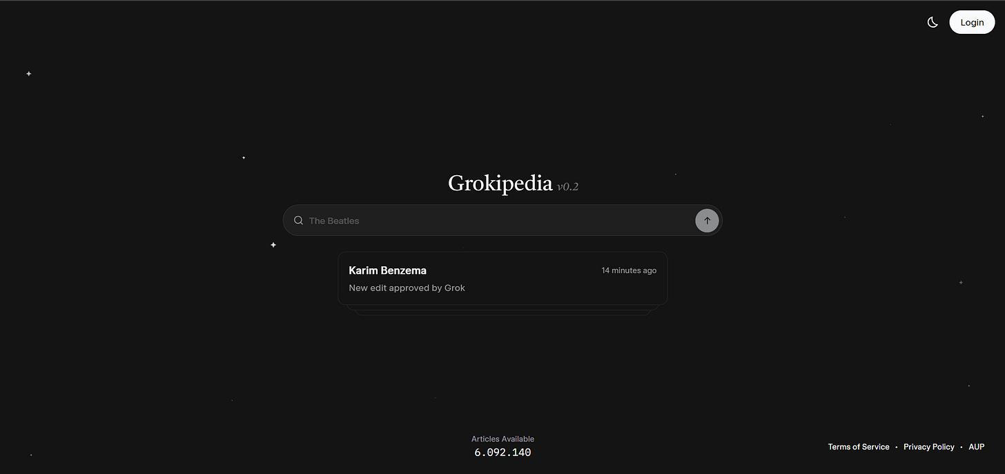 Com uma estrutura minimalista, bem ao estilo de Elon Musk, a Grokipedia não impressiona à primeira vista. A página inicial se resume a uma tela com um campo de busca central. Os verbetes só podem ser visualizados após buscas – e elas nem sempre são bem-sucedidas. Abaixo na tela aparecem aleatoriamente, em tempo real, alguns verbetes recém-criados. No rodapé, um contador exibe o número total de artigos disponíveis: até o momento desta publicação, são 6.092.140.
