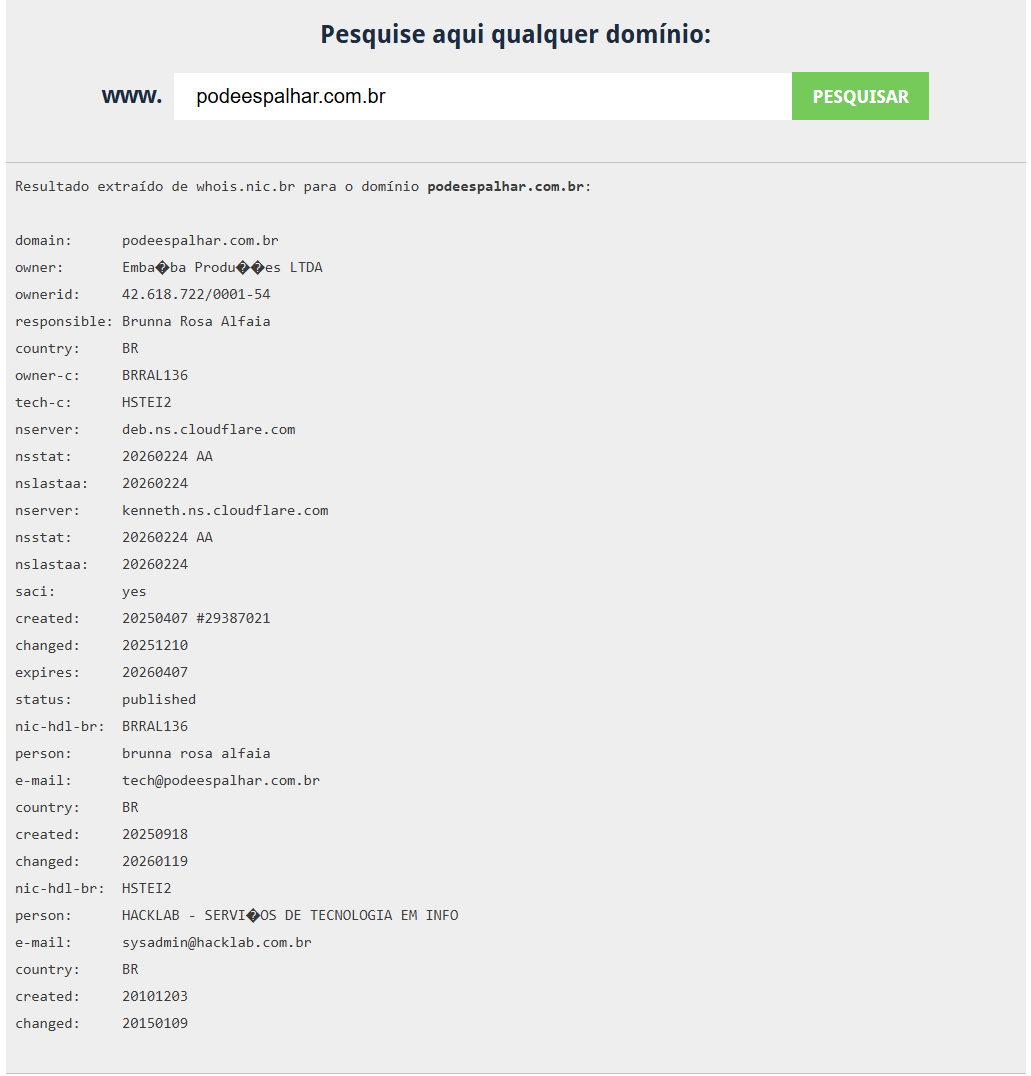 No registro técnico do domínio, consta como contato operacional a empresa Hacklab Serviços de Tecnologia em Informática Ltda, identificada no cadastro do Registro.br como responsável técnico. A Hacklab se apresenta publicamente como laboratório de software livre com atuação junto a movimentos sociais, partidos, órgãos governamentais e organizações da sociedade civil.
