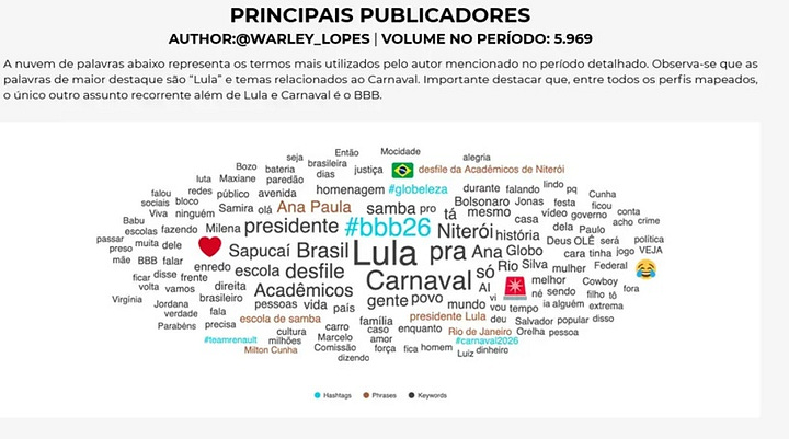 Ainda segundo o levantamento, os mil perfis mais ativos concentraram mais de 200 mil publicações sobre Lula e o desfile em apenas quatro dias. Parte dessas contas apresentou padrão predominante de retuítes em massa e baixa produção autoral, comportamento típico de estruturas voltadas à amplificação coordenada de narrativas.