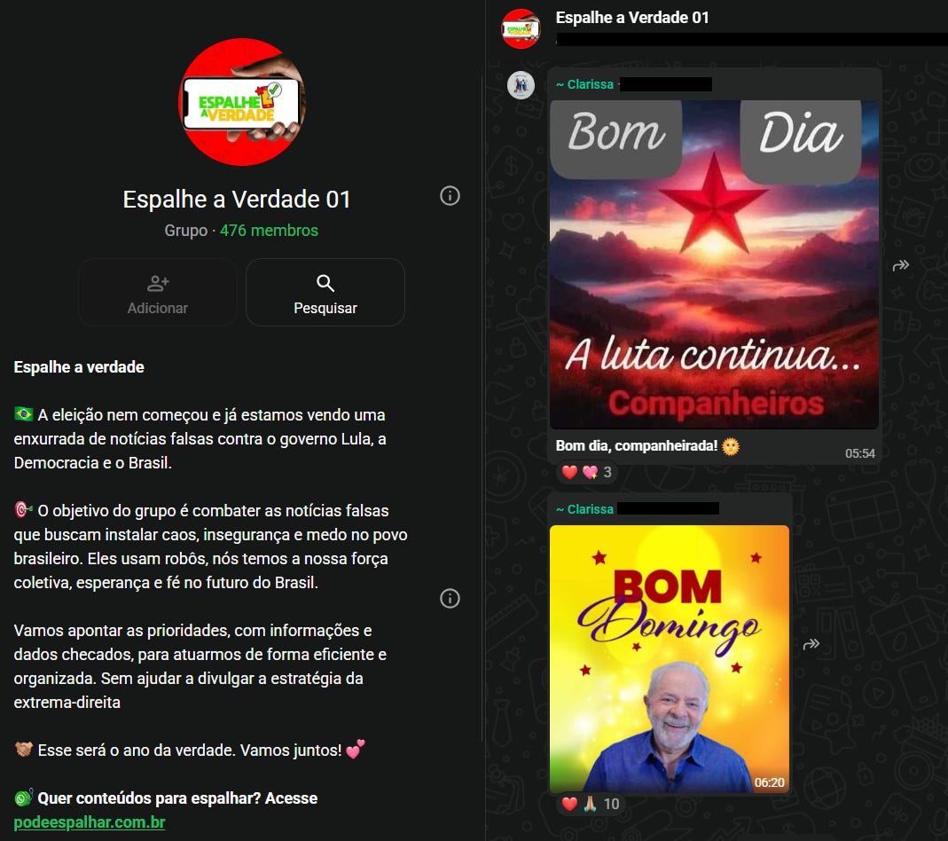 Na mesma época do desfile de carnaval, outro núcleo do Gabinete do Amor também se moveu, de forma mais discreta. Os grupos de WhatsApp usados para coordenar a militância digital lulista assumiram nova roupagem. O grupo “Caçadores de Fake News”, denunciado anteriormente por A Investigação por atuar na defesa do governo Lula e organizar campanhas coordenadas contra adversários, passou a se chamar “Espalhe a Verdade”.