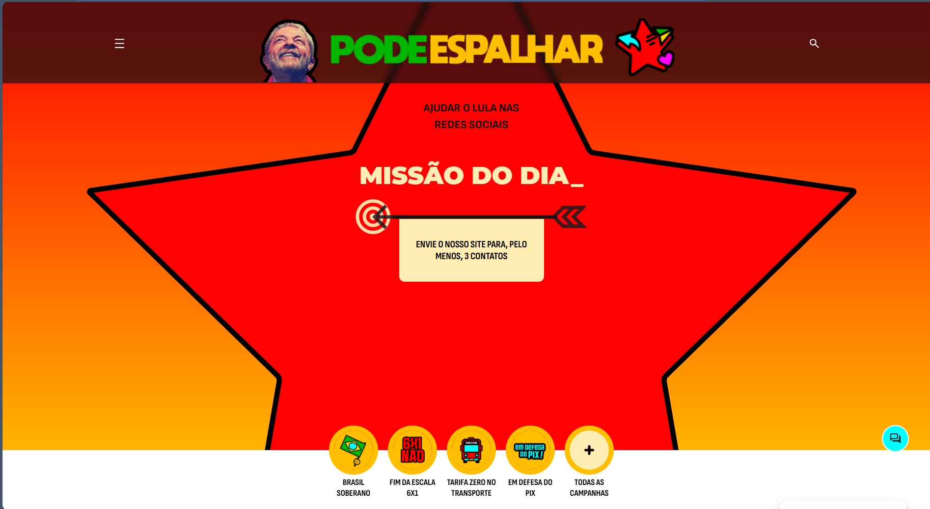 No centro do site está a seção de campanhas e conteúdos prontos para compartilhamento. Ali, a equipe responsável define o tema prioritário do dia, seleciona a narrativa e disponibiliza o material a ser replicado — vídeos, cards e falas de autoridades — acompanhado de instruções de difusão. A orientação é explícita: enviar o conteúdo, comentar, reagir, compartilhar e impulsionar a mensagem nas diferentes redes. O objetivo é padronizar o discurso e ampliar sua presença por meio de uma base mobilizada para atuar de forma sincronizada.