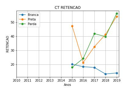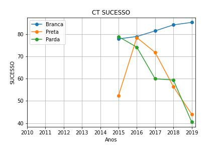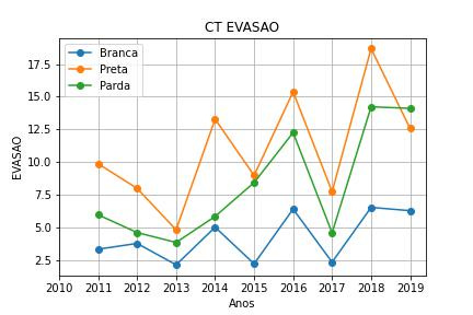 Há discrepância no comportamento das curvas, mas a evasão apresenta um comportamento com padrão mais próximo entre os três indicadores, além de ter dados estatísticos compreendendo um período maior – o que pode indicar a razão do comportamento discrepante dos outros dois indicadores. Entre 2016 e 2019, apesar da reprovação ter aumentado nas etnias pardas e negras, o índice de evasão flutua. Podendo indicar que não há necessariamente uma correlação entre evasão e reprovação.