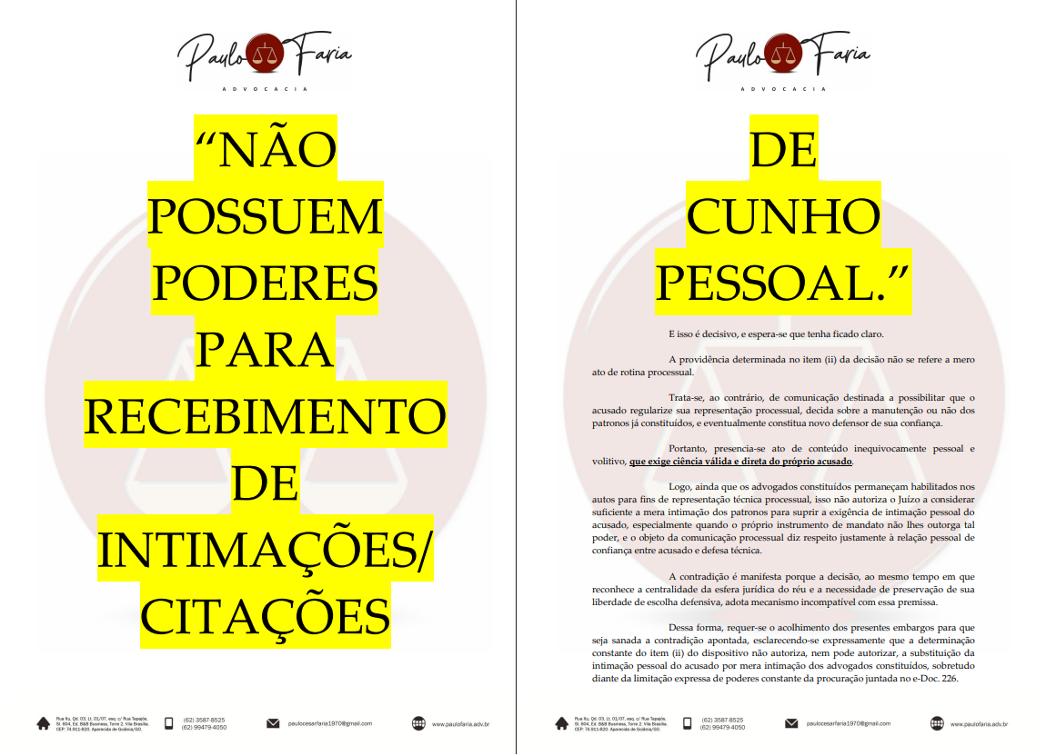 Os advogados afirmam que a audiência “já se encontrava maculada, desde sua origem, pela ausência de intimação pessoal válida do acusado”. E reforçam: “a defesa não deu causa à nulidade; a defesa reagiu a uma nulidade já instalada”.