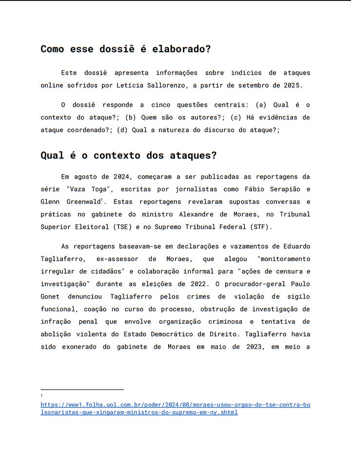 A denúncia criminal apresentada diretamente ao Supremo Tribunal Federal contra jornalistas envolvidos nas revelações da Vaza Toga foi sustentada por um dossiê apócrifo, sem autoria identificada e sem metodologia explicitada. O material — anexado à petição protocolada em 25 de outubro de 2025 — reúne capturas de tela, metadados e arquivos organizados por códigos e datas para tentar caracterizar supostos “ataques coordenados” e justificar a abertura de investigação penal contra profissionais da imprensa.