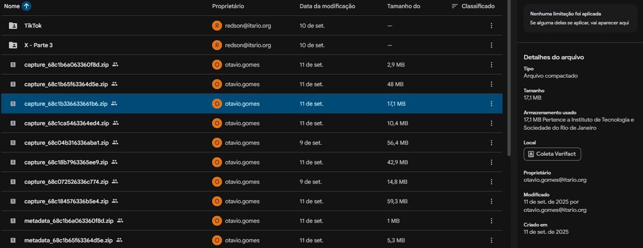 O que confere gravidade adicional ao caso é a origem do dossiê. Após termos acesso à íntegra da denúncia, verificamos que os arquivos estavam hospedados em uma pasta do Google Drive vinculada a um e-mail institucional do Instituto de Tecnologia e Sociedade do Rio de Janeiro (ITS Rio).