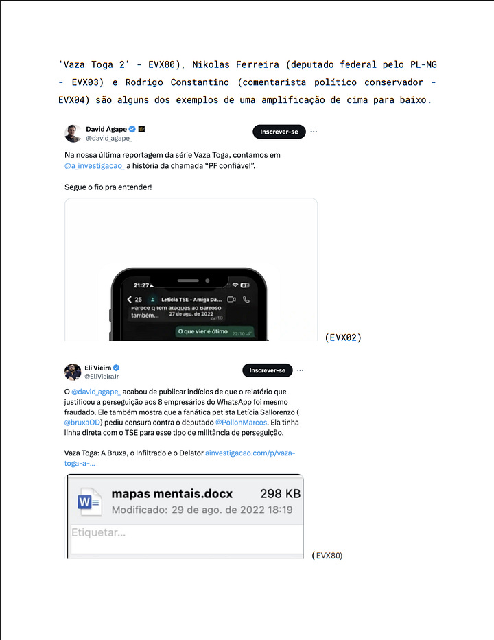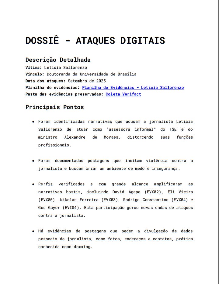O material reúne prints de postagens, comentários de terceiros — incluindo dos deputados federais Gustavo Gayer e Nikolas Ferreira —, listas de perfis, links e arquivos com metadados, organizados por códigos e datas. A estrutura sugere monitoramento contínuo e catalogação sistemática de atividades digitais pelo menos desde 9 setembro de 2025, mas a denúncia não informa quem coletou os dados, com quais critérios, em que período nem sob qual autorização.