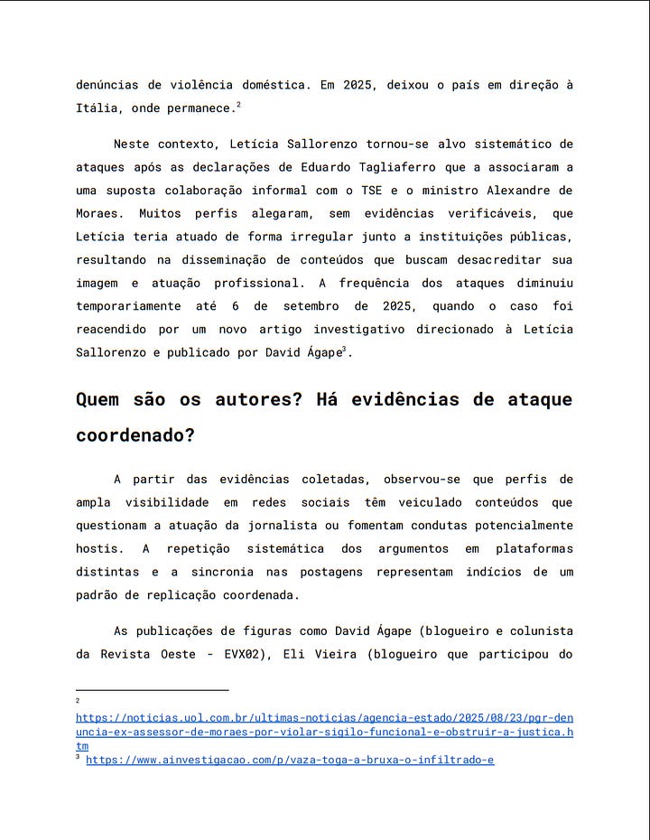 A iniciativa partiu da jornalista Letícia Sallorenzo, que pediu a inclusão de mim, David Ágape, e de Eli Vieira — além do ex-assessor Eduardo Tagliaferro — em inquéritos conduzidos pelo STF, como o das “milícias digitais”. As acusações são amplas e genéricas, indo de crimes contra a honra a associação criminosa e até abolição violenta do Estado Democrático de Direito, apesar de a peça não apontar qualquer ato concreto praticado pelos jornalistas nem demonstrar coordenação, incitação ou chamada à violência.