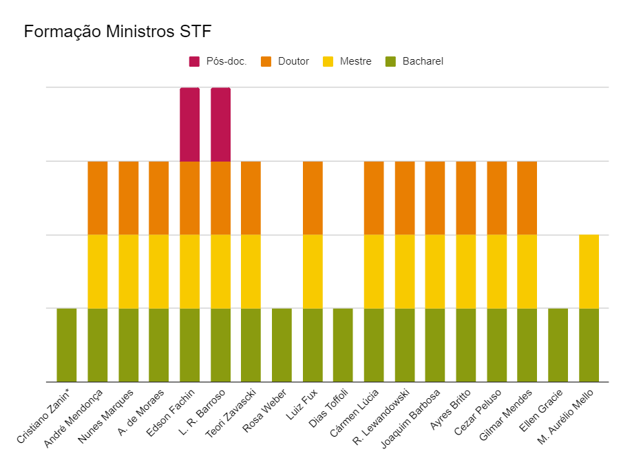 Embora a titulação acadêmica não seja um fator decisivo para a indicação de um ministro do STF, a formação de Zanin chama atenção. Se confirmado pelo Senado, Zanin será o quarto dos últimos 16 ministros indicados ao STF a não possuir mestrado ou doutorado, ao lado de Dias Toffoli, indicado por Lula, Rosa Weber, indicada por Dilma, e Ellen Gracie, indicada por FHC.