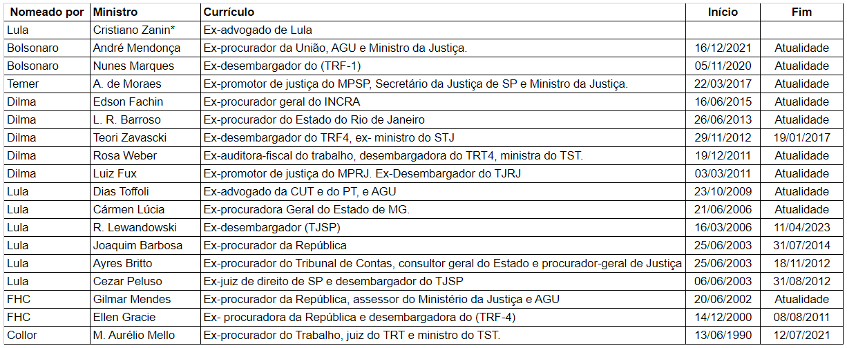 Abaixo um levantamento feito por A Investigação sobre a experiência profissional dos últimos 17 indicados ao STF, incluindo Zanin. Não foram incluídas experiências acadêmicas.