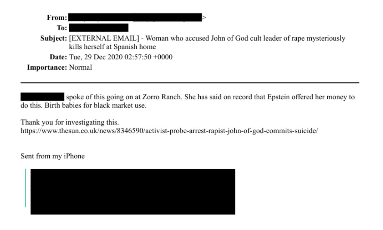 Essas declarações foram reportadas por cientistas, empresários e assessores que frequentavam seu círculo. O próprio e-mail que circulou nos arquivos do DOJ afirma que uma mulher — não identificada — teria denunciado que Epstein oferecia dinheiro para gerar bebês no Zorro Ranch, que posteriormente seriam destinados ao mercado negro.