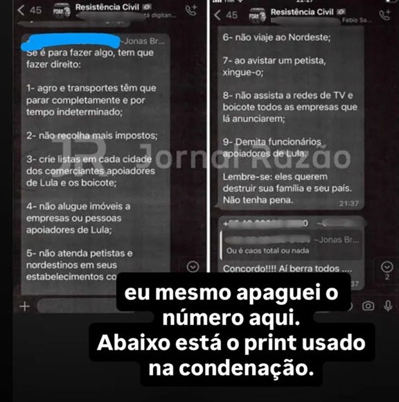 No processo de Jonas Bressan, não há vítima identificada. Nenhum comerciante deixou de atender clientes. Nenhum nordestino foi impedido de entrar em estabelecimento. Testemunhas de acusação afirmaram em juízo não saber sequer se ele era autor do texto ou integrante do grupo “Resistência Civil”. Ainda assim, houve condenação criminal e indenização coletiva.