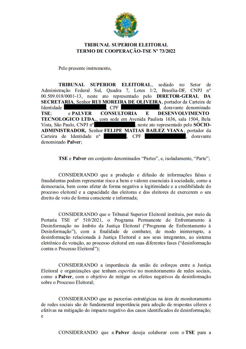 Entre os parceiros do TSE estavam o Instituto Democracia em Xeque (DX) e a empresa de tecnologia Palver Consultoria, que fornecia à Assessoria Especial de Enfrentamento à Desinformação (AEED) do TSE o acesso a um banco de dados com mensagens extraídas de centenas de milhares de grupos de WhatsApp, Telegram, Gettr e outras redes.